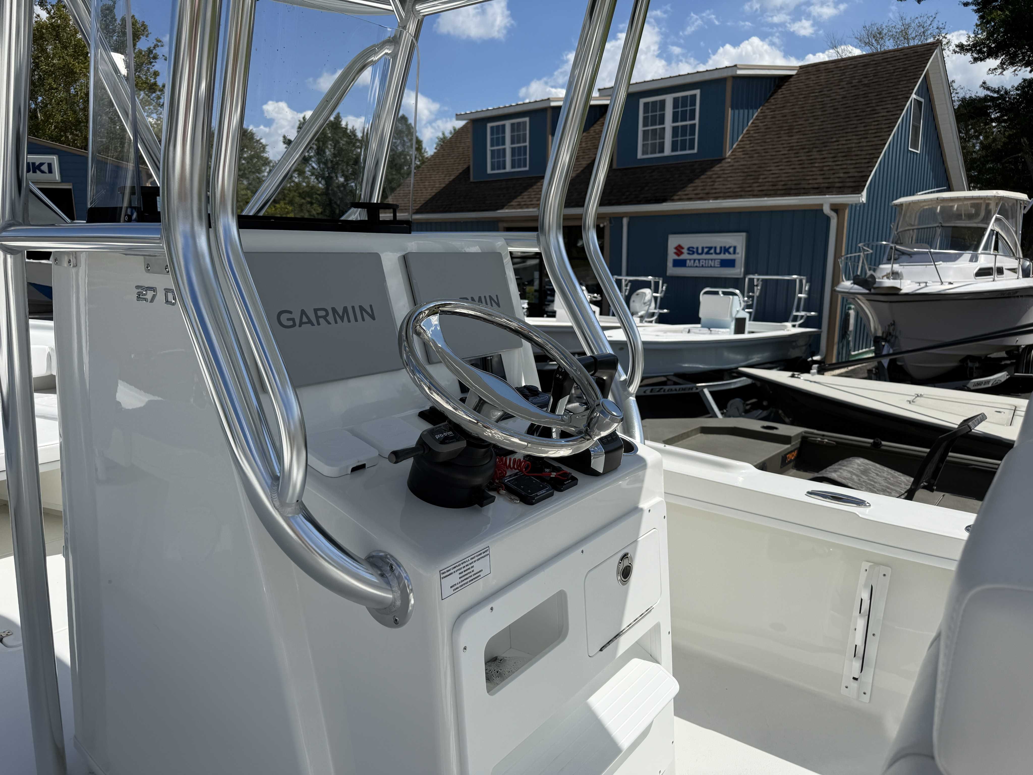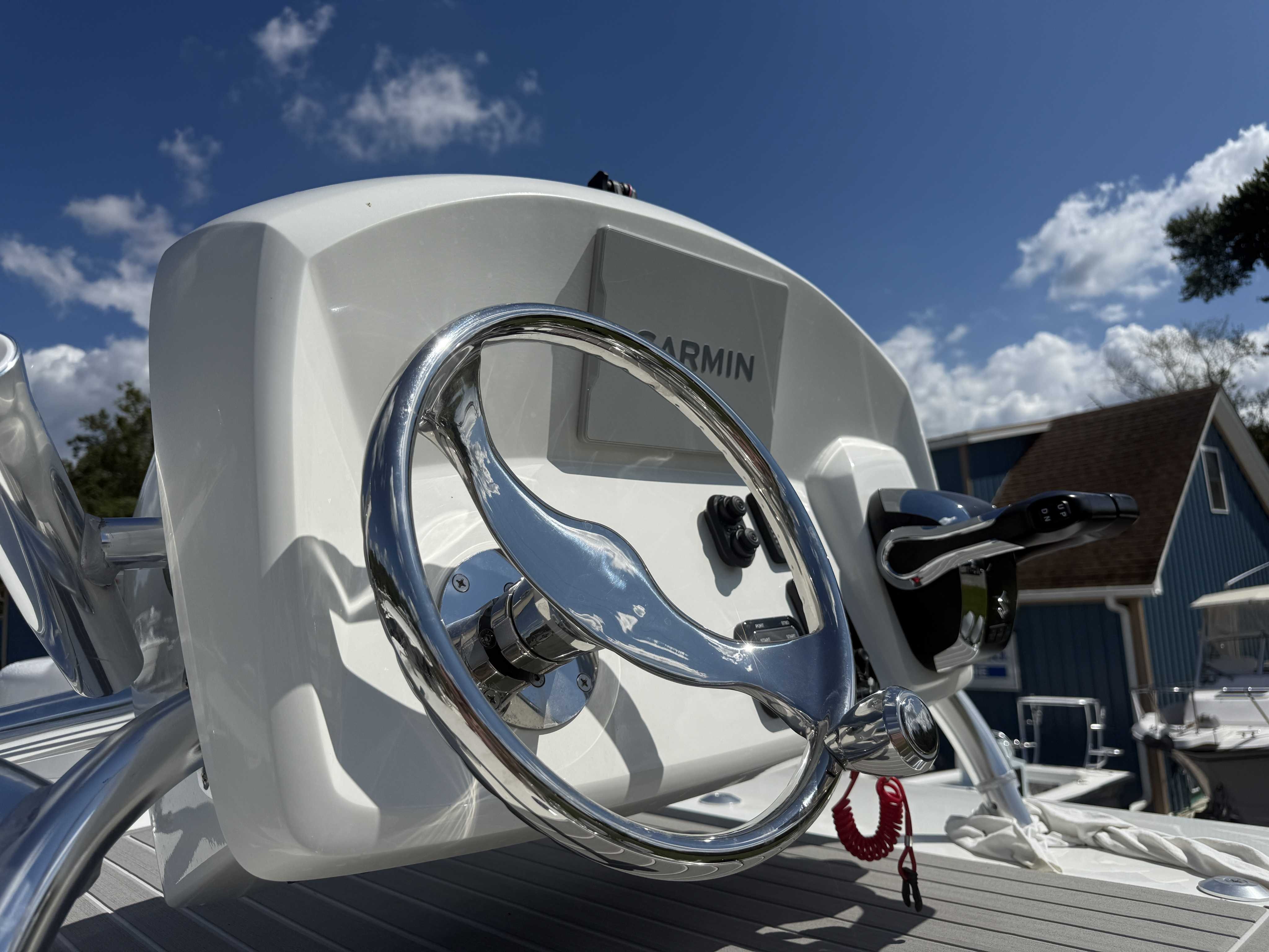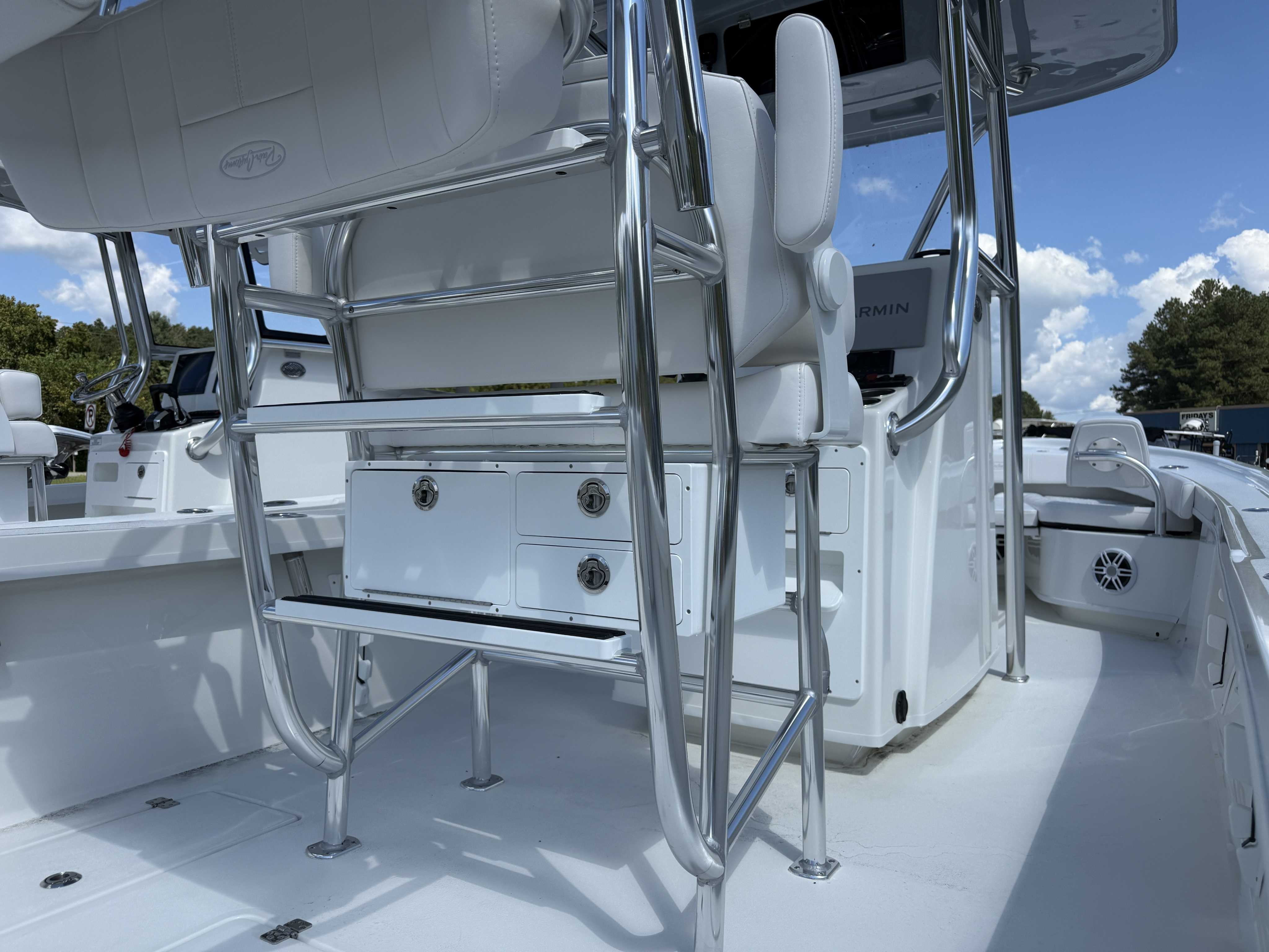 Garmin 1243XSV / Fusion Stereo RA210 head unit with 4 7.7" speakers / Garmin VHF and 5' Shakespeare antenna / B75M Thru Hull Transducer