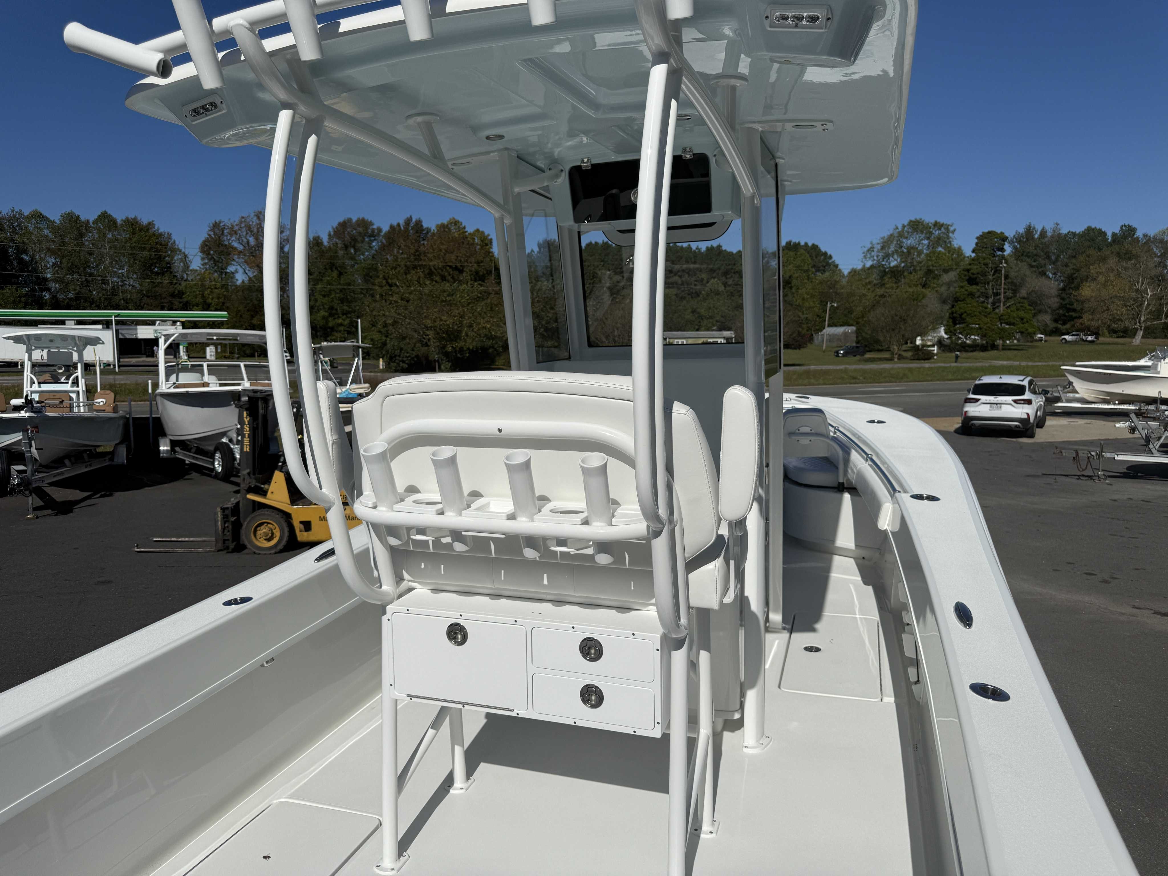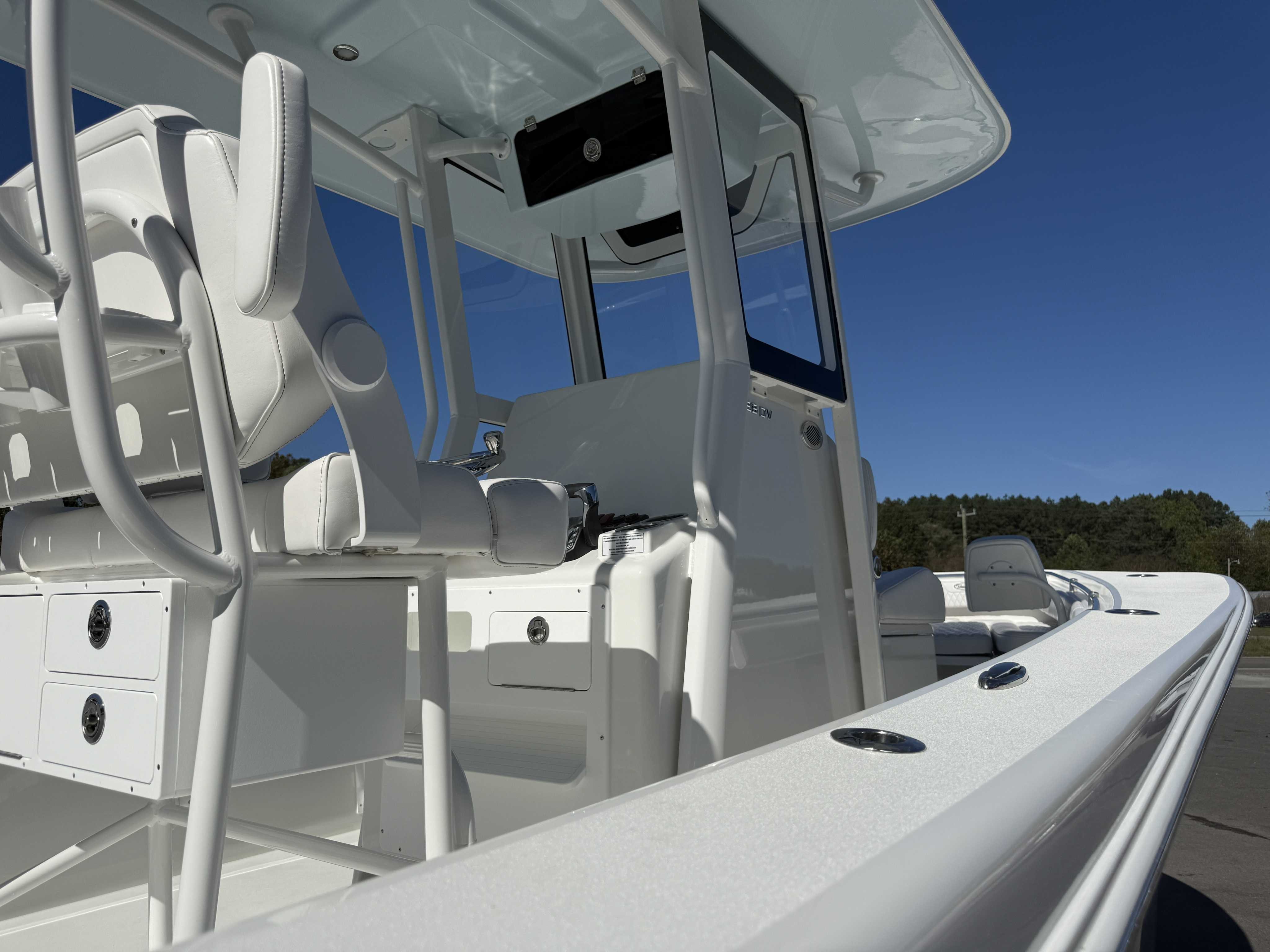 Large Fiberglass 6'X9" T Top POWDE COATED D Channel with acrylic enclosure, 5 rod holders, outrigger prep, 2 kingfish rod holders, 2 speaker pods, 2 LED lights, spreader lights, electronics box for Large Console with rear legs